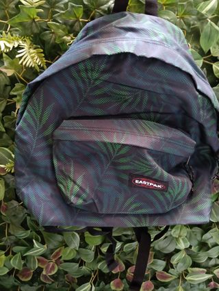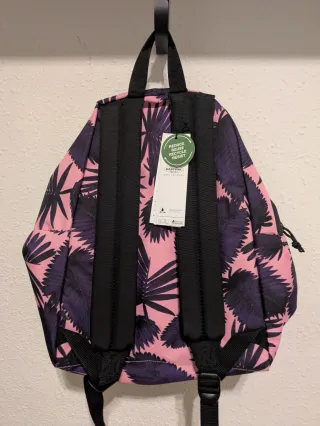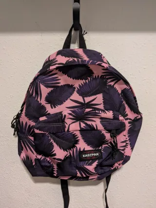 Mochila Eastpak con un bonito estampado floral. - Diseño con flores rosas y hojas tropicales. - Cierre de solapa con correa. Las asas estan algo gastadas por dentro. (Ver fotos)