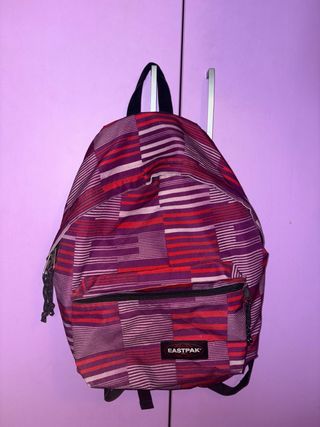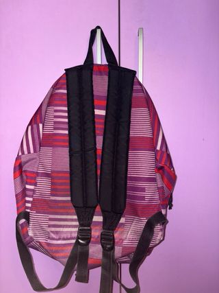 Mochila con un diseño de rayas en tonos morados y rojos. - Estampado geométrico. - Cremalleras negras. Sirve perfectamente para llevar cosas pero la parte de abajo está un poco desgastada, y los bolsillos tienen tinta de rotuladores y bolis, que con un poco de limpieza se puede quitar (por ello el precio).