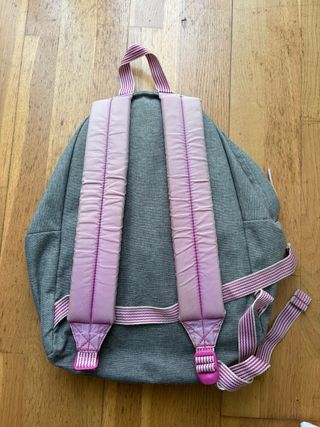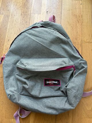 Mochila de la marca Eastpak. Las cremalleras funcionan perfectamente. - Color gris jaspeado. - Detalles en color rosa fucsia. - Tirantes ajustables.