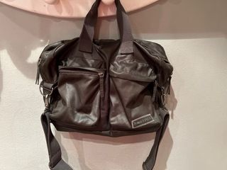 Mochila bandolera de polipiel en estado aceptable. Múltiples compartimentos (para portátil hasta 17", 2 para líquidos en laterales y otros muchos). Todas las cremalleras funcionan perfectamente. Medidas aproximadamente.