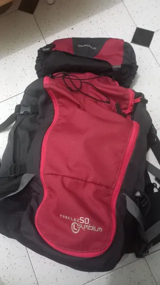PRECIO NO NEGOCIABLE. GRACIAS Mochila de 50l Quechua. Color amarillo y verde caqui. Cremalleras perfectas. Espaldera ergonòmica Cremallera bajos para guardar calzado. Bolsillo interior con cremallera. Enganches palos. Enganche a la cintura i al pecho. Medidas: Alto: 0,65 cm Ancho: 0,40 cm aprox. Punto de recogida es en Horta