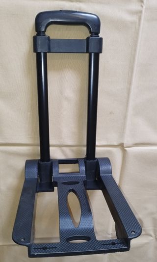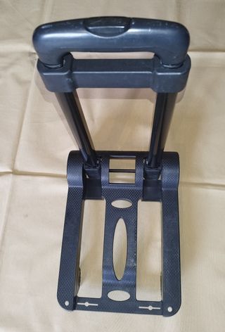 Portamaletas plegable de color negro, diseñado para facilitar el transporte de equipaje. Estructura de metal resistente, con asa ergonómica para un agarre cómodo y base amplia para mayor estabilidad. Diseño compacto para un fácil almacenamiento. Medidas totalmente plegado: ancho, 23cm; fondo, 43 cm; altura, 8 cm. Medidas base apoyo: ancho, 23 cm; fodo 27 cm Altura extendido, 96 cm Peso: 1,3 kg.