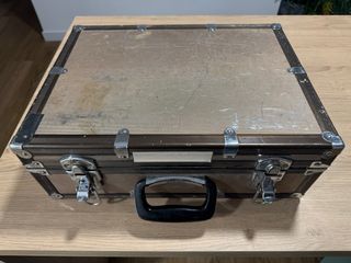 Estuche rígido de aluminio con un diseño clásico y funcional. Presenta signos de mucho uso. Principalmente usado de pedalera y estuche de camara. Precio Negociable. - Construcción robusta en aluminio. - Acabado en tonos marrones y plateados. - Cierres de seguridad metálicos. - Asa de transporte ergonómica.