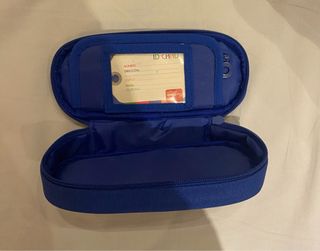 Estuche escolar de color azul, con un práctico tarjetero en la tapa interior. - Diseño ovalado. - Cierre de cremallera. - Tarjetero para identificación.
