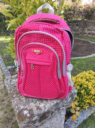 Mochila escolar rosa. Con bolsillos exteriores e interiores.