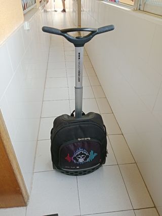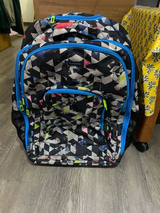 Mochila escolar con ruedas, ideal para transportar libros y material escolar con comodidad. Está en muy buen estado. - Diseño moderno y juvenil. - Incluye asa de mano y ruedas para facilitar el transporte. - Compartimento principal amplio y espacioso. - Bolsillo frontal con cierre. Color negro