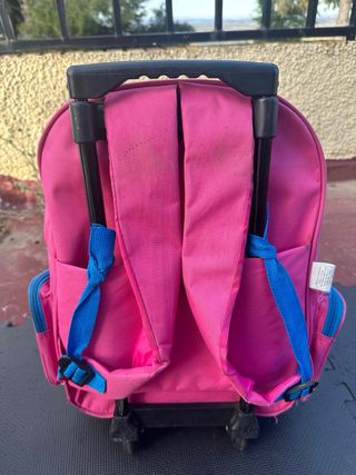 Mochila infantil con ruedas, ideal para el colegio. Es rosa y tiene detalles azules. - Perfecta para llevar libros y material escolar. - Diseño juvenil y alegre. - Asa de mano y ruedas para facilitar el transporte.