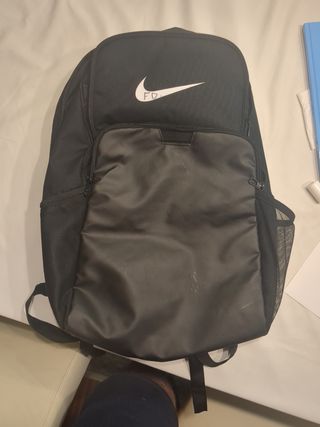 Mochila deportiva Nike en color negro. Perfecta para llevar tus pertenencias. Perfecta para llevar material escolar ya que dispone de 2 compartimentos principales amplios. También tiene espacio para llevar calzado deportivo y ropa. Malla con cremallera dentro del compartimentos para llevar ordenador. Bolsillo pequeño para llevar llaves o cosas pequeñas - Compartimento principal amplio. - Bolsillos laterales de malla. - Cierre de cremallera. Tiene las siglas de mi nombre marcadas