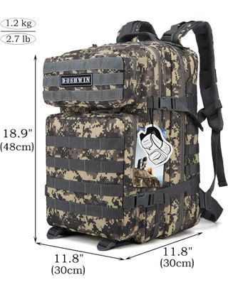 mochila táctica multiusos de 50 litros Es adecuado para deportes al aire libre, como camping, senderismo, trekking, viajes, pesca, y también es adecuado como mochila escolar, bolsa de herramientas o mochila de gimnasio. Está hecho de tela Oxford 900D de alta densidad, resistente al desgaste, al desgarro y al agua. Gran capacidad, múltiples compartimentos y áreas MOLLE lo harán más conveniente. Dimensión: 30 X 30 X 48 CM (11,8 X 11,8 X 18,9 pulgadas) Peso: 1,2 KG (2,7 libras) Material de la tela: 900D Oxford Género_objetivo: Unisexo Tejido impermeable: Sí Cremallera Ultraresistente Correa de cintura y correa de pecho: