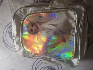 Mochila escolar, está bastante bien, usada, pero cuidada, salvo las redecillas laterales que están algo rasgadas...se pueden coser y queda como nueva. Color azul celeste. Los dibujos cetrales hacen como tornasol brillante. Muy cómoda.