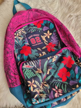 Mochila escolar Beecool en tonos rosas y naranjas. Es una mochila ideal para el colegio o actividades extraescolares. Hay dos modelos otra en tonos azules. - Diseño estampado con flores. - Cremalleras en perfecto estado. - Perfecta para llevar libros y material escolar.