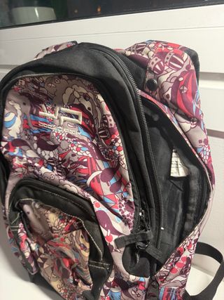 Mochila escolar con dos departamentos grandes y otro más pequeño. Con doble cremallera. Refuerzo y acolchada la espalda. Soporte para colocarla en ruedas. Tiene unos pequeños agujeros en el soporte del agua pero sigue siendo funcional. Con signos externos de uso pero en perfecto estado.