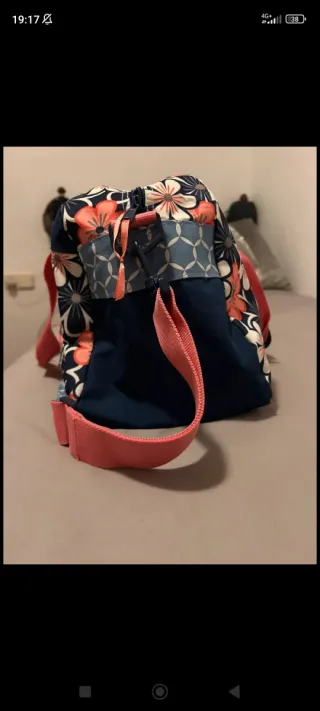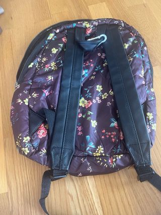 Bolso mochila con estampado floral. Cierre principal con cremallera. 3 bolsillos con cremallera exteriores, 2 laterales y 1 trasero. 1 bolsillo con cremallera interior. Correas ajustables. Medidas 23 x 29 x 11'5 cm (ancho x alto x fondo). Moda mujer. Estado bueno. 10 euros