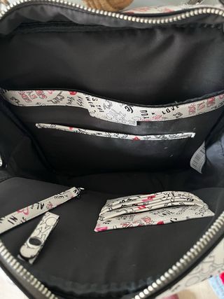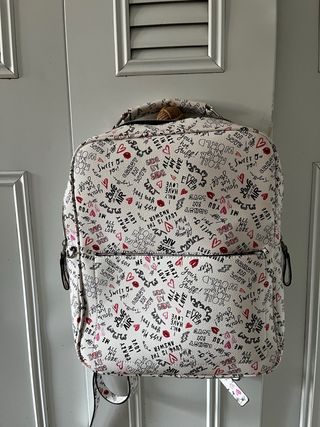 Maleta tipo mochila con un diseño divertido y original. Perfecta para llevar tus pertenencias con estilo. - Estampado con texto y corazones. - Cierre de cremallera.