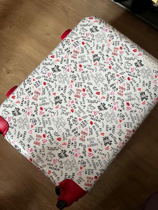 Conjunto de maleta y mochila de la marca Parfois con un divertido estampado. - Maleta de cabina. - Mochila a juego. - Diseño con texto y corazones.