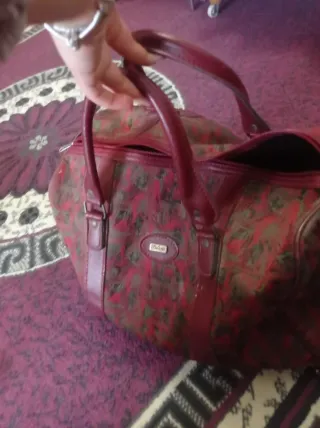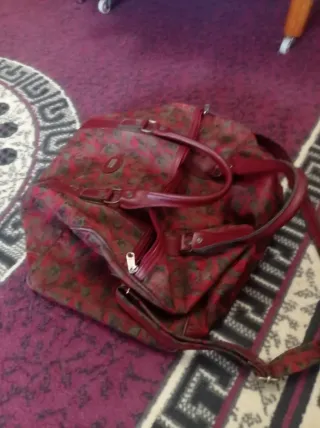 Práctica bolsa de equipaje con un diseño llamativo. - Estampado floral en tonos rojos y marrones. - Asas de mano y correa para hombro. - Cierre de cremallera.