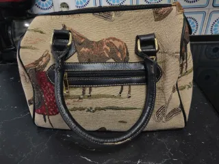 Bolso de mano con un bonito estampado de caballos y detalles en cuero. - Diseño tipo bombonera. - Cierre de cremallera. - Asas de mano cómodas.
