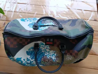 Mochila Sprayground con un diseño único y llamativo. - Estampado de olas y camuflaje. - Detalles de cuadros marrones. - Cremallera principal. - Asas de mano negras.