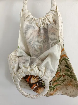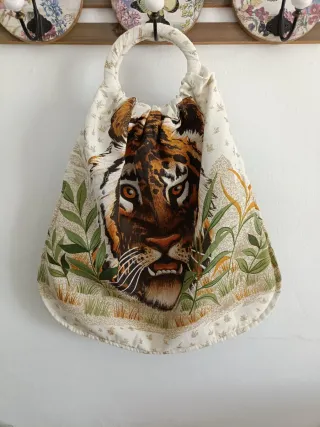 Bolso de tela con un llamativo estampado de tigre y detalles de vegetación. - Asa redonda. - Cierre fruncido. - Diseño único.