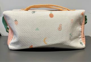 Práctica bolsa de viaje con un divertido estampado de frutas y palmeras, ideal para los más pequeños. Cuenta con asas cómodas para su transporte. - Diseño con motivos frutales y tropicales. - Asas de mano y correa para colgar. - Sin usar. - Medidas: Largo 46, Alto 22, Ancho 13