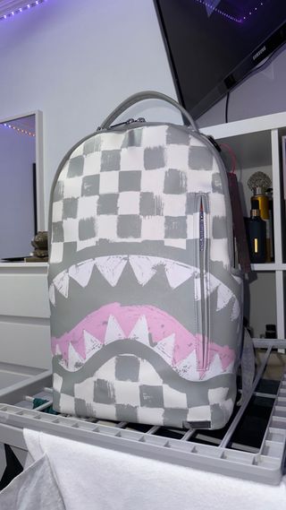 Mochila con diseño de tiburón y estampado de cuadros de la marca Sprayground, esta como nueva, la vendo porque no la uso y la tengo de decoracion - Estampado de cuadros en gris y blanco. - Detalle de boca de tiburón con dientes blancos y lengua rosa. - Cremallera frontal vertical.