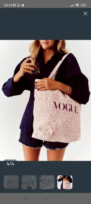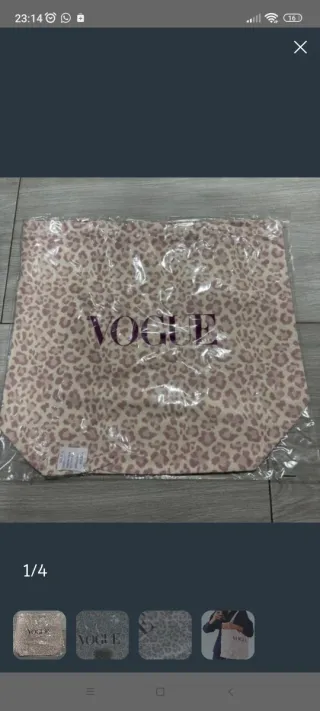 Práctica bolsa de tela con un llamativo estampado de leopardo en tonos morados claros. - Diseño con el logo de VOGUE. - Color base beige con manchas en tonos rosas y marrones.