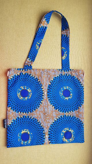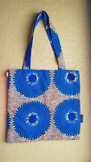 Bolso de tela de algodón con bonito estampado, lo he usado varias veces, pero está en buen estado. Tiene goma en la parte superior cerca de las asas.