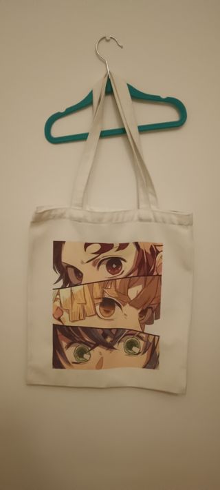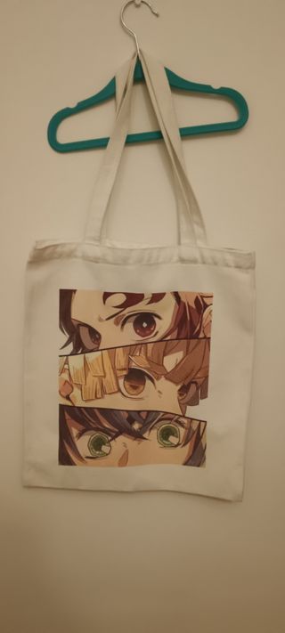 Preciosa tote bag de tela blanca estampada con los personajes de Demon Slayer. Es perfecta para llevar al trabajo, a la universidad o de compras. - Diseño con imágenes de Tanjiro, Zenitsu e Inosuke. - Ideal para fans del anime.