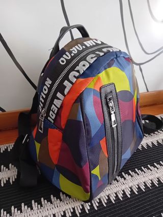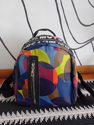 Vendo mochila pequeña con un diseño vibrante y llamativo. Cierre con cordón y botón y dos bolsillos pequeños