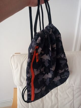 Mochila pequeña con un diseño moderno y práctico. - Estampado de camuflaje con flechas. - Cremallera frontal de color naranja. - Cierre de cordón ajustable.