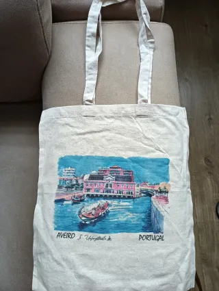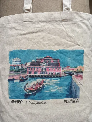 Bolsa de tela con un bonito estampado de la ciudad de Aveiro, Portugal. Ideal para llevar tus compras o pertenencias. Nueva. - Diseño multicolor con escena de canal y edificios. - Texto AVEIRO Is Unforgettable PORTUGAL en la parte inferior.