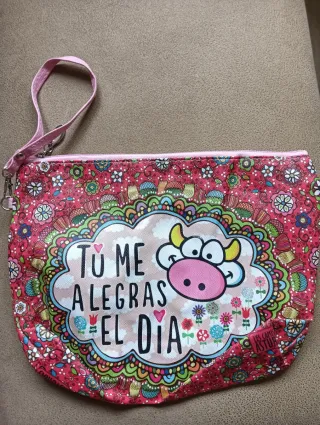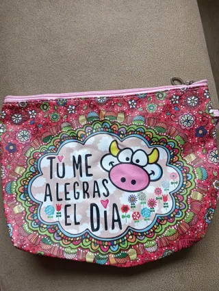 Neceser con un divertido estampado de vaca y la frase Tú me alegras el día. Ideal para llevar tus esenciales. Nuevo, sin estrenar. 29x21 - Diseño colorido y alegre. - Cierre de cremallera. - Asa lateral para facilitar su transporte.