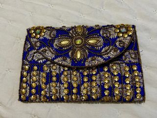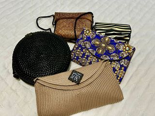 Conjunto de bolsos de diferentes estilos y materiales. - Bolso redondo negro tejido. 8€ - Bolso/cartera tipo sobre beige con broche. 8€ - Bolso árabe de seda azul con pedrería y bordado. 12€ - Bolso marrón tejido con asa. 4€ - Bolso mini con estampado de cebra. 4€ Preferible vender todos juntos. Precio del lote 25€