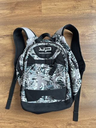 Mochila con un diseño llamativo y moderno. - Estampado artístico en tonos grises, azules y negros. - Compartimento principal con cierre de cremallera. - Bolsillo frontal adicional. - Correas de hombro ajustables y acolchadas.