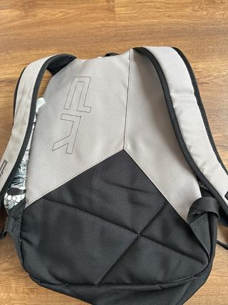 Mochila deportiva Nike con un diseño llamativo. - Estampado en tonos grises y rojos. - Asa superior y correa para hombro. - Bolsillo frontal con cremallera. - Bolsillo lateral de malla.