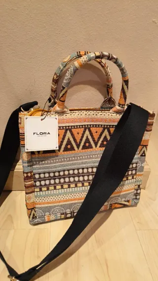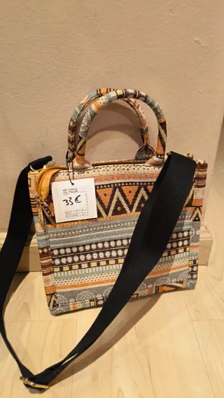 Bolso de mano con un diseño étnico y vibrante. Presenta un estampado geométrico en tonos naranjas y multicolor. - Asa corta para llevar en la mano. - Correa larga ajustable para llevar cruzado o al hombro. - Cierre principal con cremallera.