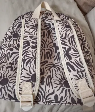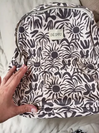 Mochila de tela con un diseño original y llamativo. - Estampado de palmeras y soles. - Etiqueta LIVE SIMPLY en la parte frontal. - Bolsillo exterior con cremallera.