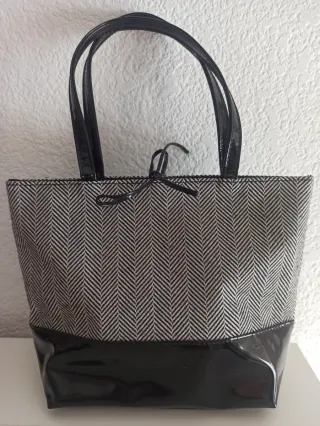 Elegante bolso de mano con un diseño clásico y moderno. - Estampado de espiga en la parte superior. - Base y asas de charol brillante. - Cierre con lazada decorativa.