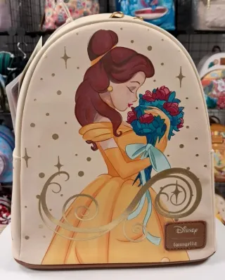 Mochila con diseño de Bella de La Bella y la Bestia. - Estampado de Bella con flores. - Detalles dorados y estrellas. - Parche con logo de Disney y Loungefly.