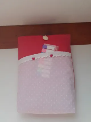 Funda para libro con bolsillo exterior. - Parte inferior con estampado de lunares blancos sobre fondo rosa. - Adorno de encaje blanco con corazones rojos. - Cierre con botón. - Mide 22x29cm.