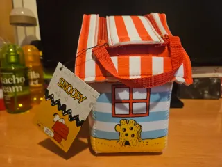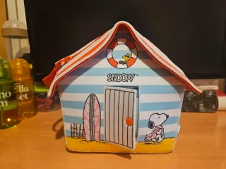 Este neceser con diseño de casa de playa es perfecto para llevar tus esenciales. - Estampado de rayas azules y blancas. - Detalle de tabla de surf y Snoopy. - Cierre de cremallera naranja. #snoopy