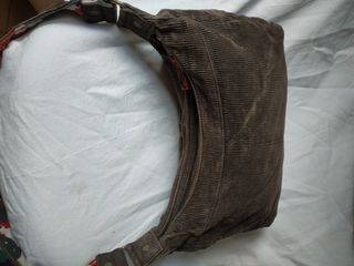 Bolso de pana marron, con cremallera, pequeño,corto de hombro,dos bolsillos exteriores con brochete rematado con botones como adorno, interior, bolsillo con cremallera,forro estampado.