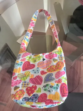 Bolso de tela con un alegre estampado de corazones en varios colores. Cierra con cremallera y bolsillo exterior con velcro