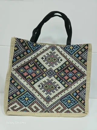 Bolso de mano con un diseño vibrante y colorido, perfecto para la temporada. Medidas : 29cm Alto X 33cm Largo X 14cm ancho - Estampado geométrico. - Asas negras. - Material de yute.