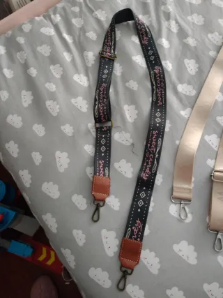 Correas de repuesto para bolso, con un diseño moderno y detalles únicos. - Correa principal de tela azul con estampado. - Detalles en cuero marrón. - Hebillas metálicas para ajuste y sujeción. - Correa adicional de tela beige satinada.