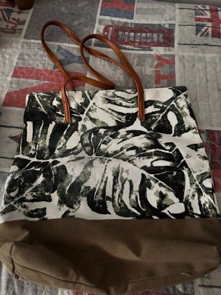 Bolso de tela con un diseño de hojas tropicales y base de lona. - Estampado de hojas verdes y blancas. - Base de lona en color marrón. - Asas de cuero sintético.