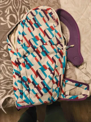 Mochila con un diseño vibrante y moderno. - Estampado geométrico en tonos rojos, azules y morados. - Tirantes acolchados para mayor comodidad. - Compartimento principal con cierre de cremallera.