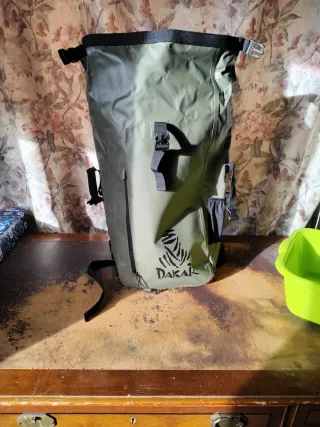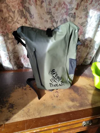 Mochila oficial de la marca Dakar, con un diseño moderno y funcional. Perfecta para tus aventuras.Plastico reforzado - Color verde militar. - Cierre enrollable. - Logo de Dakar estampado.