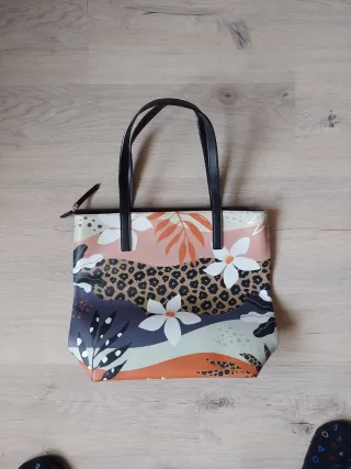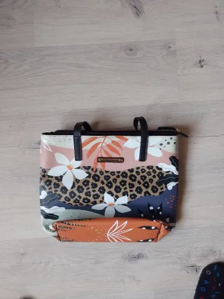 Bolso de mano con un estampado de animales y hojas tropicales. - Cierre de cremallera. - Bolsillos exterior y interior - asa bandolera ajustable. Está completamente nuevo , tanto el asa para colgar como el agarre de la cremallera exterior estan precintados , tal y como venian de tienda . Se envía o se entrega personalmente .