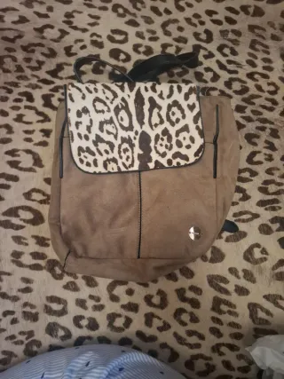 Mochila con un diseño llamativo y moderno. - Parte frontal con estampado de leopardo. - Acabado en ante. - Tiras negras. - Detalle metálico en el lateral.